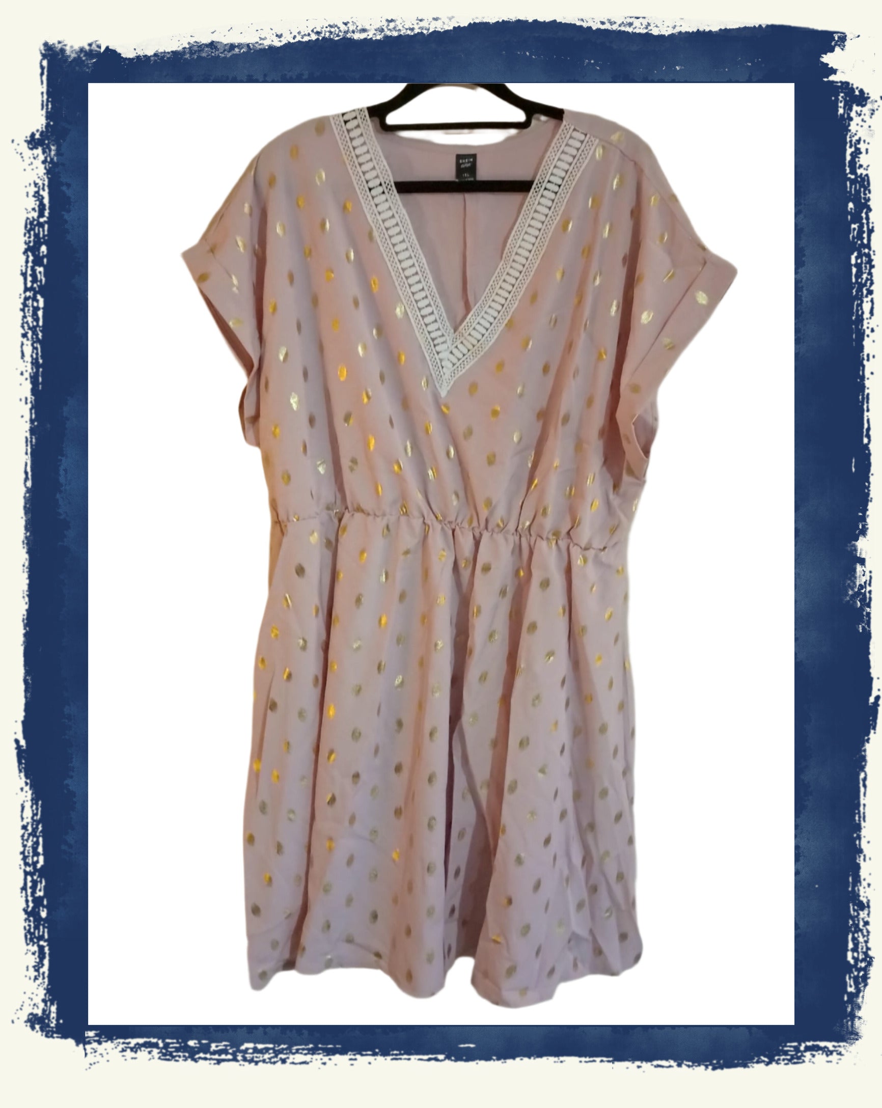 Tea Dress with Gold Dots and Lace Trim Neckline